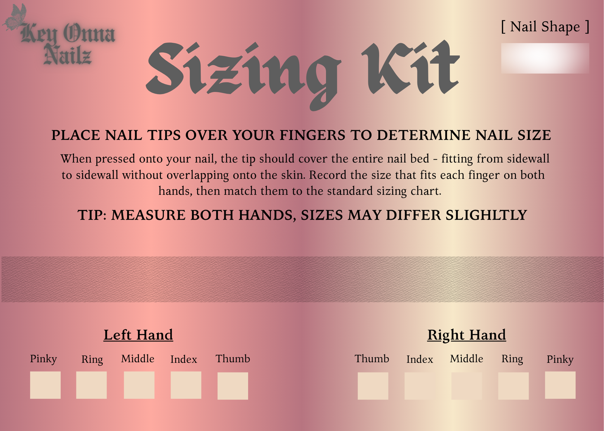Please purchase this kit prior to requesting a custom order. review the sizing guide here. Sizing Kit $10.00 Size: Select Size Short Square Medium Square Long Tapered Square Medium Almond Medium Stiletto Long Stiletto Medium Coffin Long Coffin Add to cart